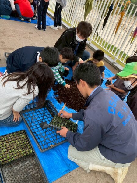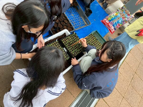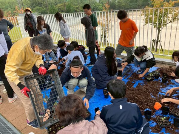 10班に分かれて、ビオラ、クリサンセマム、キンセンカ苗を鉢上げしました。 セル苗の取り出しに苦戦する小中学生にアドバイスしたり、鉢上げ済みの苗を動線を考えたりと、協力してスムーズな作業体制を整えていく高校生たち。