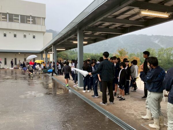 大雨の降る10月31日(金)、園芸デザイン専攻三年生は、池田市立ほそごう学園3年生と7年生とともに鉢上げ作業を行いました。