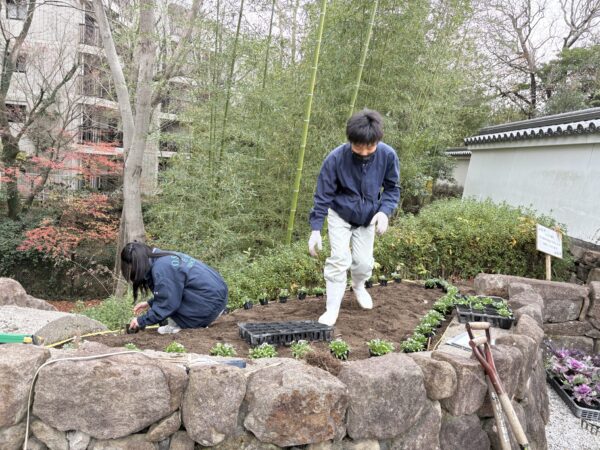 今回は園芸デザイン専攻の三年生がデザインし、二年生の有志が定植するという学年を超えた取り組みとなりました。