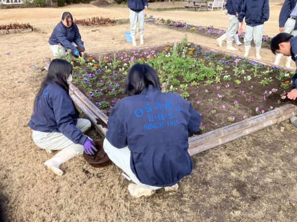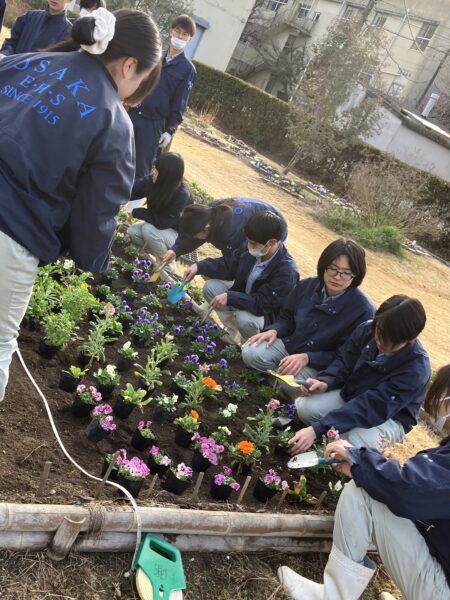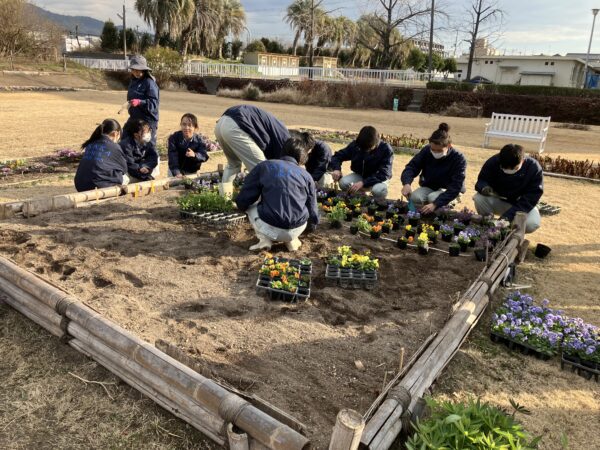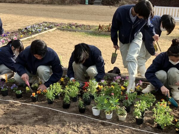 1/9(金)に3年1組、1/13(火)に3年2組の園芸デザインの授業で花壇の定植を行いました。