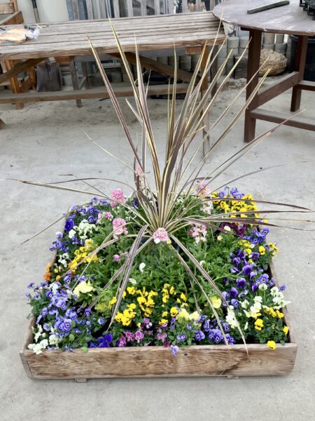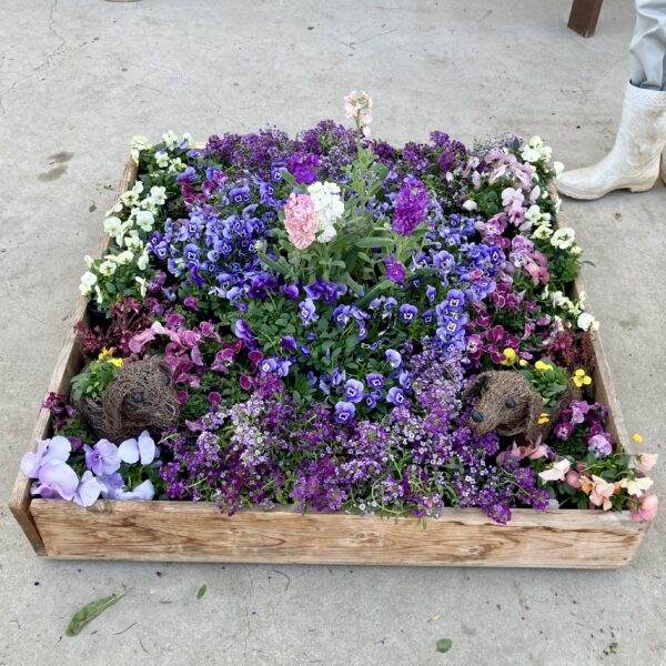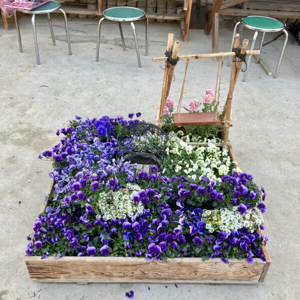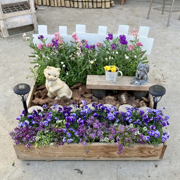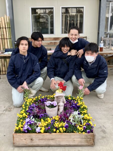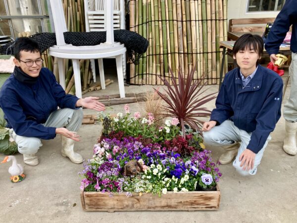 3年園芸デザインの授業で、1月20日に2組、1月23日に1組が、箱庭を作りました。約1m四方の箱に生徒たちが育てた花苗や小物を入れて、庭や森など、花のある風景の一部を作ります。
