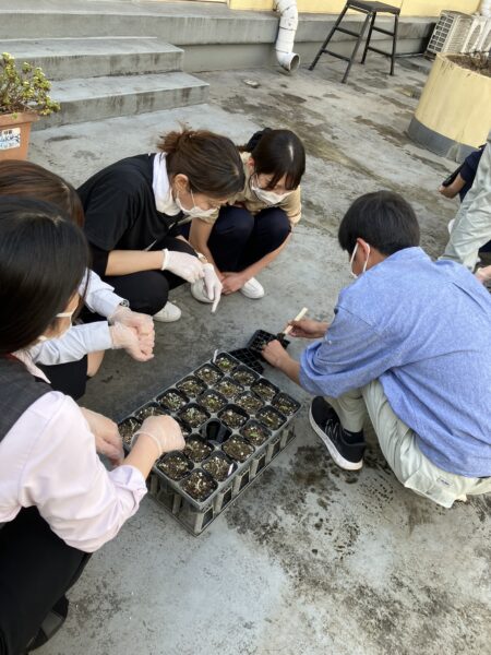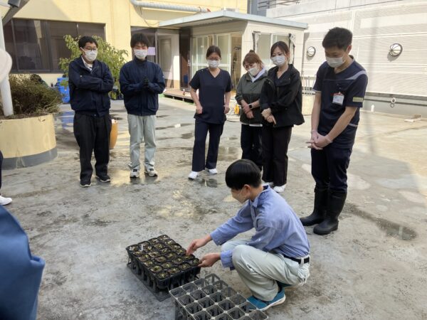 今回は小さな苗をポリポットに移植する『鉢上げ』という作業を行いました。園芸高校の生徒達が手本を見せて説明をし、病院のスタッフの皆様にも行ってもらいました。