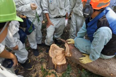 9月16日に大阪府森林組合様に来校していただき、実習庭園において、樹木の伐採を実…