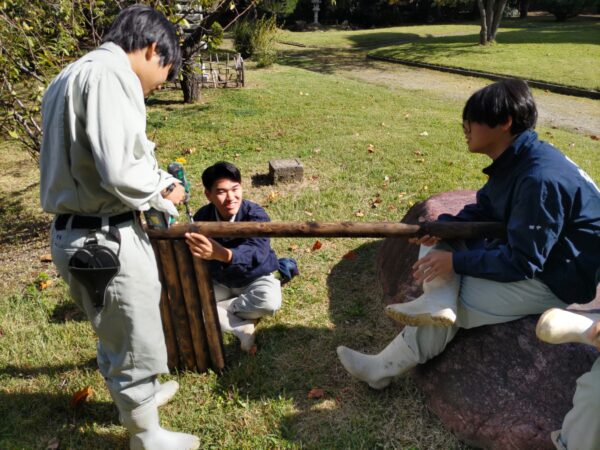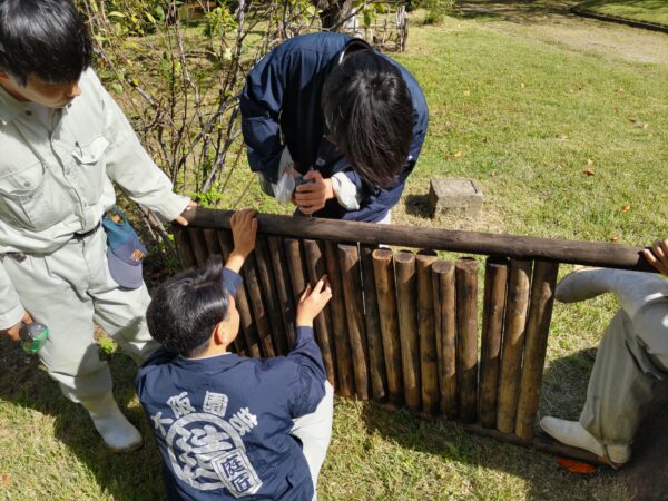 環境緑化科の活動ブログ 3年生の実習(桟橋づくり) 2025.10.31 先日、3年生の実習で、以前壊された桟橋の修理を行いました。 先週、杉丸太をカットし、防虫防腐処理したものを組み立てて完成させました。 破損した桟橋 材料 丁寧にビスで留めていきます 上下、左右でバランスが悪くならないように固定していきます 完成 実習庭園の池にあります 創立記念祭では、是非見に来てください。 Prev Next 一覧へ戻る