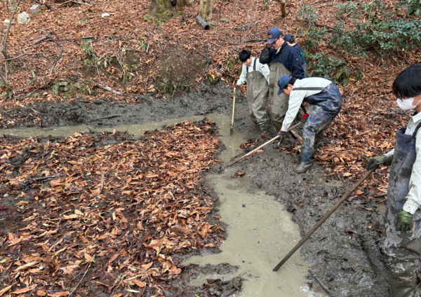私たちは、令和6年12月から月1回、モリアオガエルの調査に取り組んでいます。