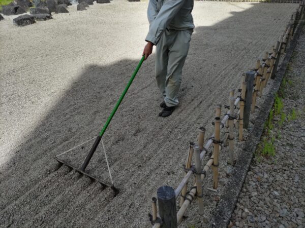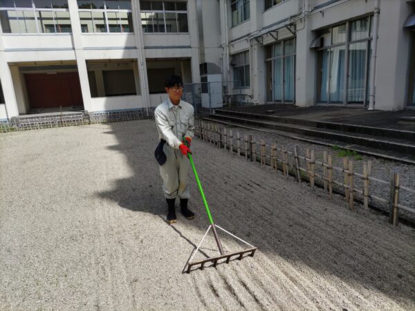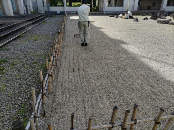 環境緑化科の活動ブログ 3年生の実習(砂紋引き) 2026.04.22 3年生の造園技術実践という実習科目で枯山水式庭園の砂紋引きを行いました。 真っ直ぐ引くことは難しく、やり直しもありましたが、何とか完成しました。 砂紋は引き始めが難しい 慎重にゆっくりと コツはしっかりと集中して引く 初めての砂紋引き実習では上出来だと思います Prev 一覧へ戻る